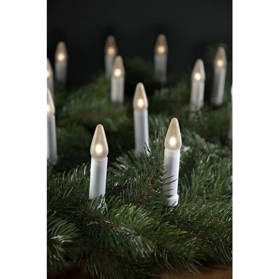 Beautiful matte candles in one strip. Led warm white, not replaceable. Material plastic. Cord and mounting part dark green.