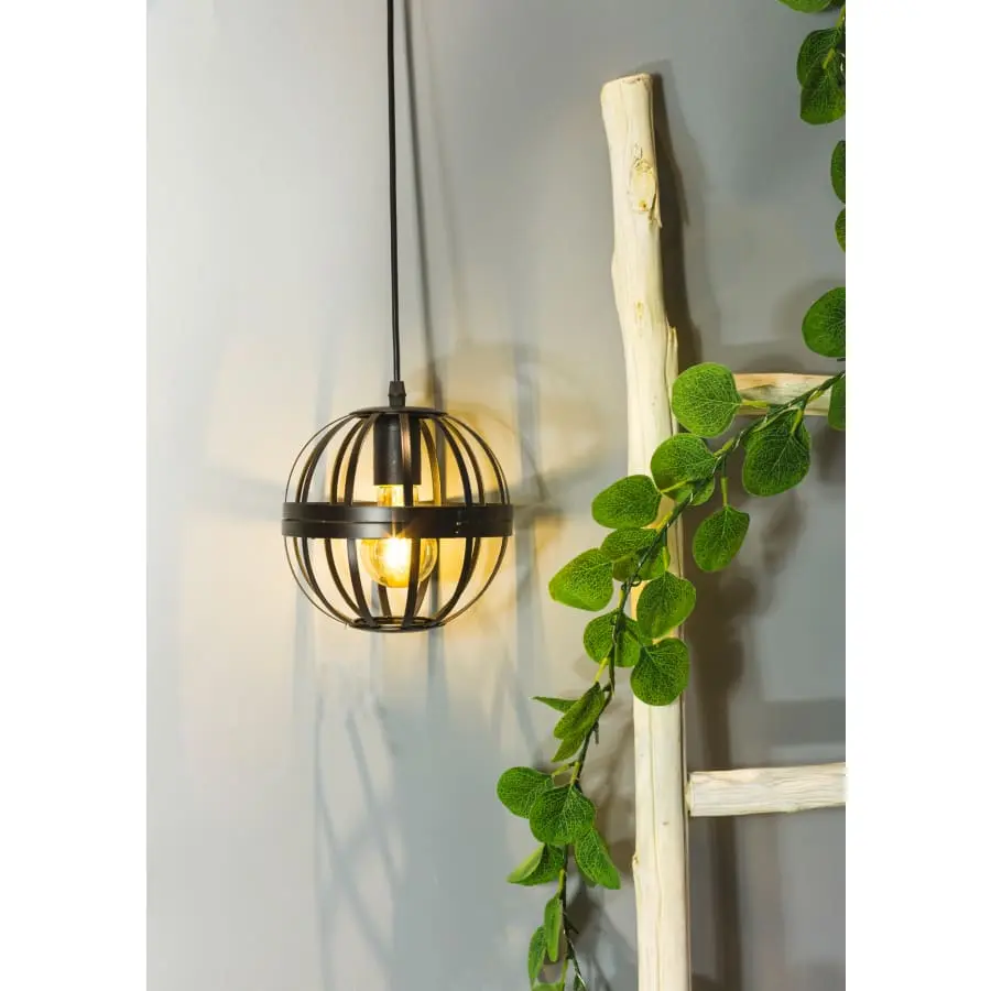 Stylish decorative lamp. Inside the round metal frame is a fixed LED filament lamp, warm white shade. Mounting hook in the battery case. No batteries included, 4 x AA required.