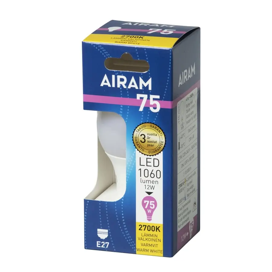 Lampans färgtemperatur är behagligt varmvit (2700 K). Den opala ljuskällan ger bländfritt ljus. Den miljövänliga kartongförpackningen är färgkodad. Färgen indikerar glödlampans motsvarighet och gör valet enklare.