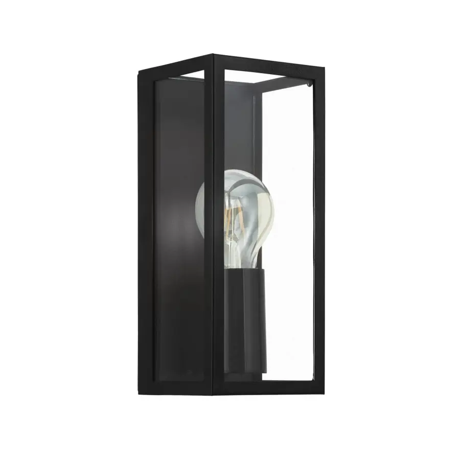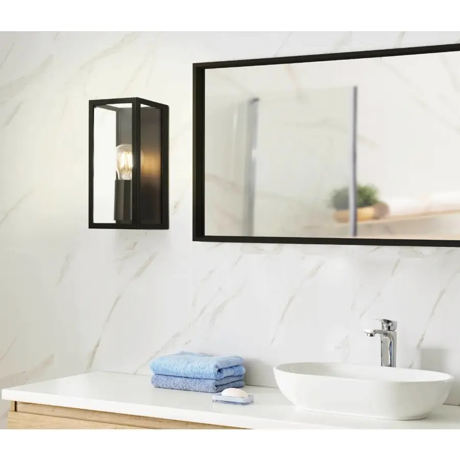 The AMEZOLA wall light has a black metal frame and clear glass panels with a visible lightbulb design. The wall light is the perfect finishing touch for modern interiors, and with IP44 protection against spray water, it offers a distinctive lighting solution for the bathroom. The pictured filament bulb is not included. The product has an E27 lamp holder and requires 1 E27 lightbulb.
