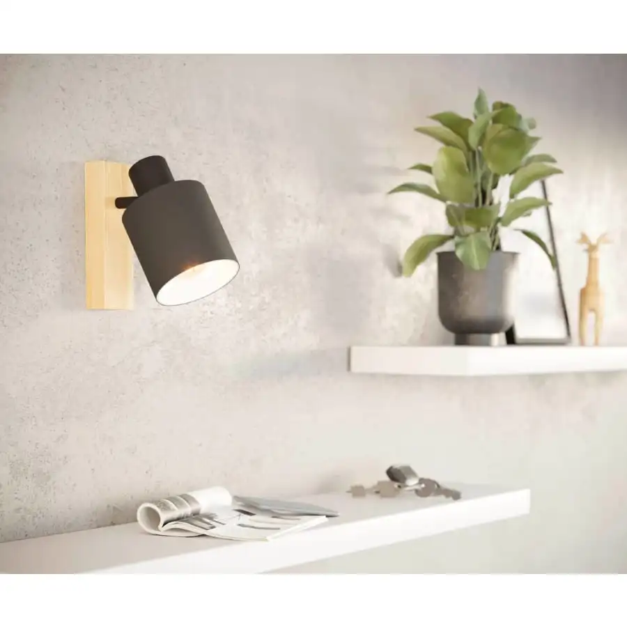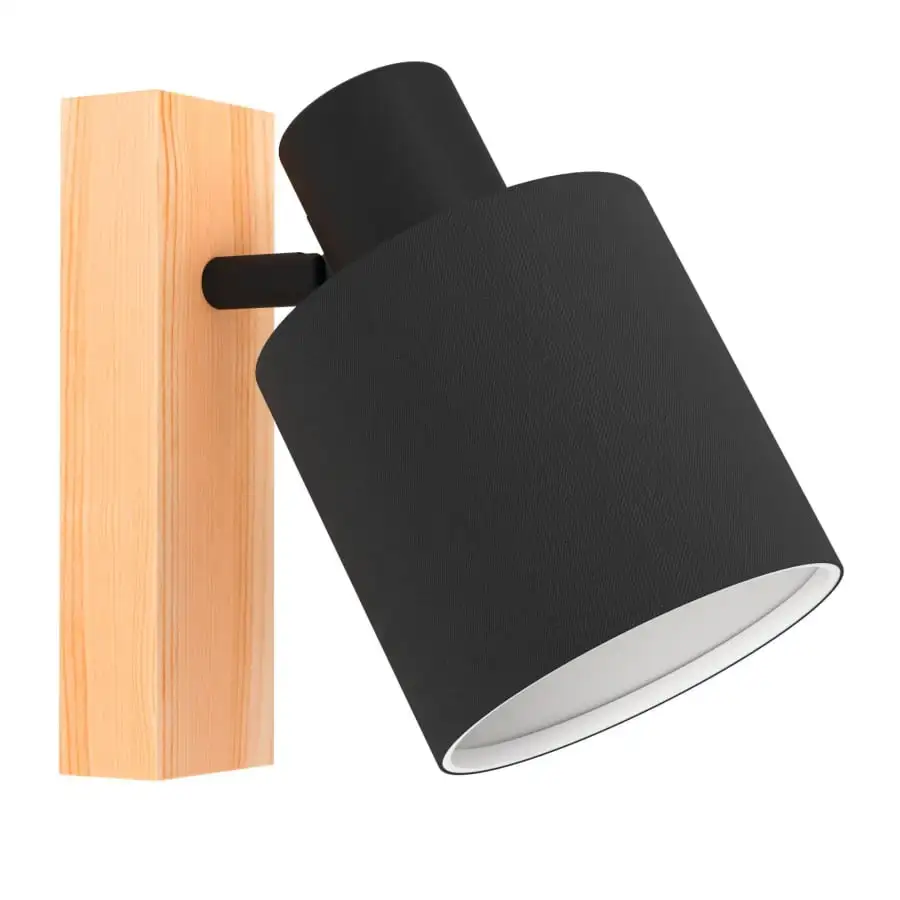 The BATALLAS wall and ceiling spotlight features an adjustable black fabric lampshade with an inner white lining and a natural pine wall mount. The wall-mounted spotlight can be integrated into modern interiors and used as a ceiling light. The pivoting head allows you to adjust the light to accentuate individual areas of the room, whether in the living room, the bedroom, the hallway or the dining room. The product requires 1 E27 lightbulb that is not included.