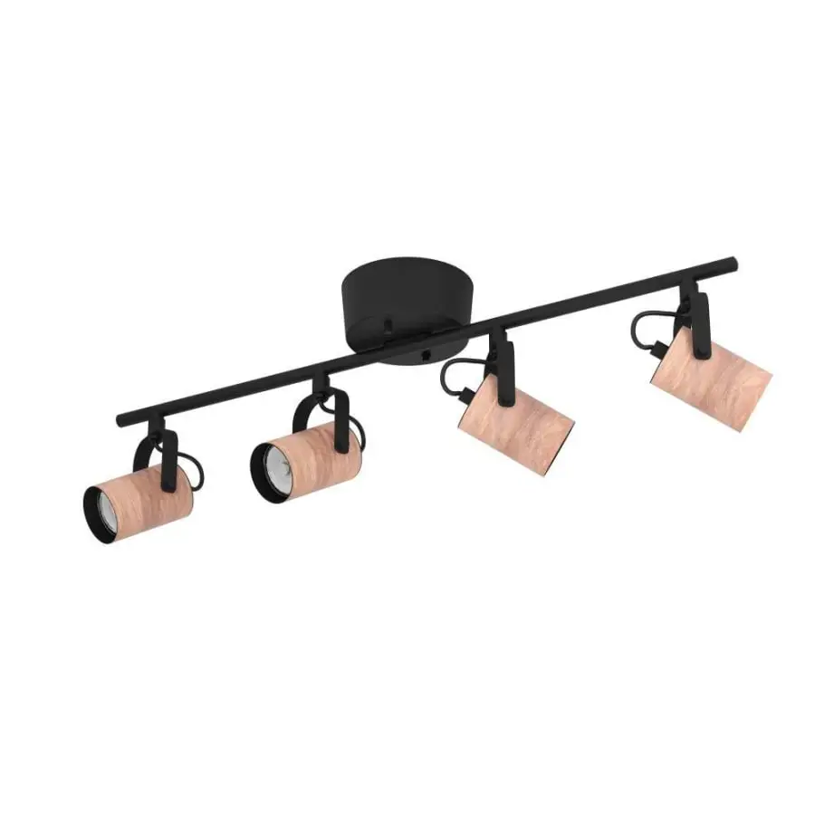The LED ceiling light CAYUCA is made of black metal with four movable spots. The natural-colored wood decor, which is located on the outside of the respective spot head, provides the lamp with an exciting mix of materials. The minimalist and at the same time special look of the ceiling spotlight rounds off modern furnishings perfectly and offers targeted illumination in the room – whether in the kitchen, living room, bedroom or hallway. The LED GU10 bulbs are included in the scope of delivery and provide a pleasant warm white light.