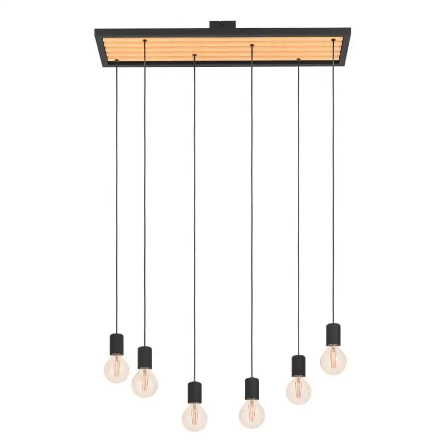 The CONSETT pendant light features a rectangular black metal frame mount with rubberwood beams arranged lengthways. The pendant mount has six black metal lamp holders that hang at different heights. The individual lamp holders have adjustable heights. The pendant light features a minimalist design inspired by nature, blending with any home living trend, and is perfect to pair with different lightbulbs. With a length of 78 cm, the product will create an eye-catching feature above the table in the dining room. The pictured filament lightbulbs are not included. The product has E27 lamp holders and requires 6 x E27 lightbulbs.
