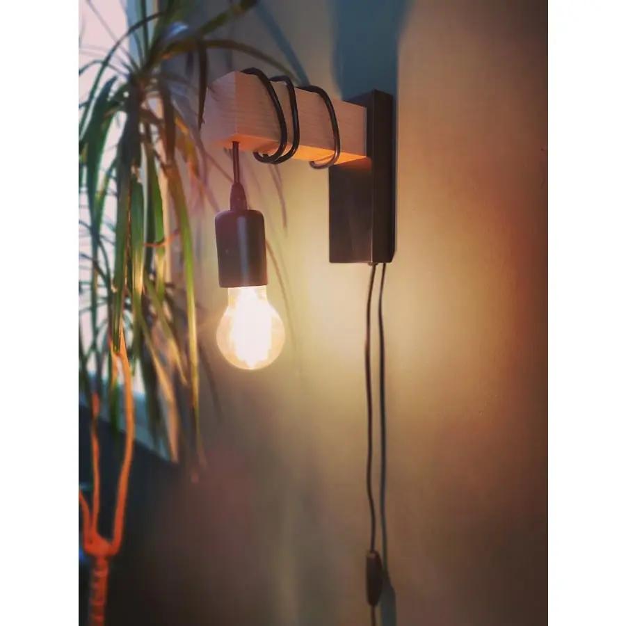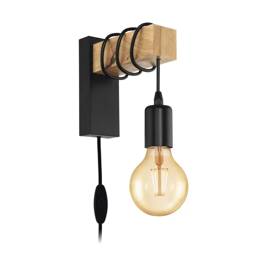 The TOWNSHEND wall light is made of black metal and has a wooden arm and a black lamp holder. With its eye-catching mix of pinewood and metal, the wall light complements vintage and industrial-style interior design trends. The product provides distinctive lighting for any space, whether in the living room, bedroom, hallway or dining room. The pictured filament lightbulb is not included. The product has an E27 lamp holder and requires an E27 lightbulb.