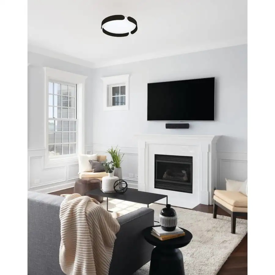 The VALCASOTTO LED ceiling light features a round white LED light element and decorative frame made of three black metal elements. The ceiling light creates uniform warm white lighting due to its shape and plastic cover. The ceiling light blends superbly into modern and minimalist interiors and provides cosy lighting for any space, whether in the living room, bedroom, hallway or dining room.