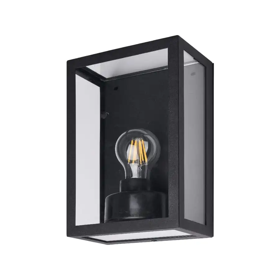 En klassiskt utseende vägglampa som även kan monteras utomhus tack vare skyddsklassen IP44. Den svarta metallramen flankeras av klara glaskupoler, genom vilka glödlampan vackert visas. Ljuseffekt 1xE27. Bredd 16cm, djup 11,2cm och höjd 25cm.