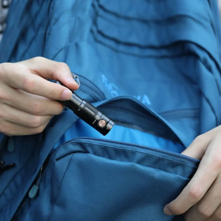 - Paketet innehåller: Fenix E09R ficklampa, USB-C-laddningskabel, nyckelring, utbytbar O-ringstätning, användarmanual.