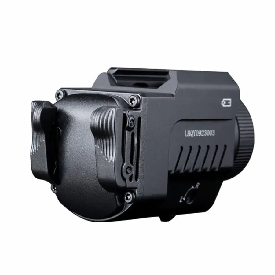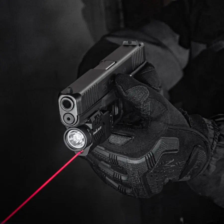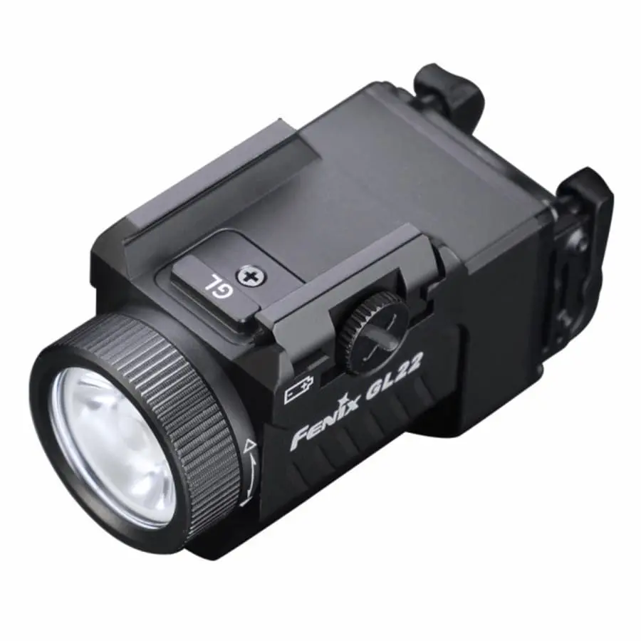 Fenix GL22 vapenljus / pistolljus med laser. Fenix GL22 är en av marknadens mest kraftfulla kombinationsljus för kompaktljus och lasersikte designad för pistolanvändning. GL22 fästs enkelt på GLOCK- och Picatinny-skenor och den mekaniska låsskruven garanterar den bästa låsningen under extrema förhållanden. Dubbelströmbrytaren, som kan användas med båda händerna, ger lampan ett bländande ljusutbyte på 750 lumen med en hand, antingen stadigt brinner, momentant eller med en stroboskop.