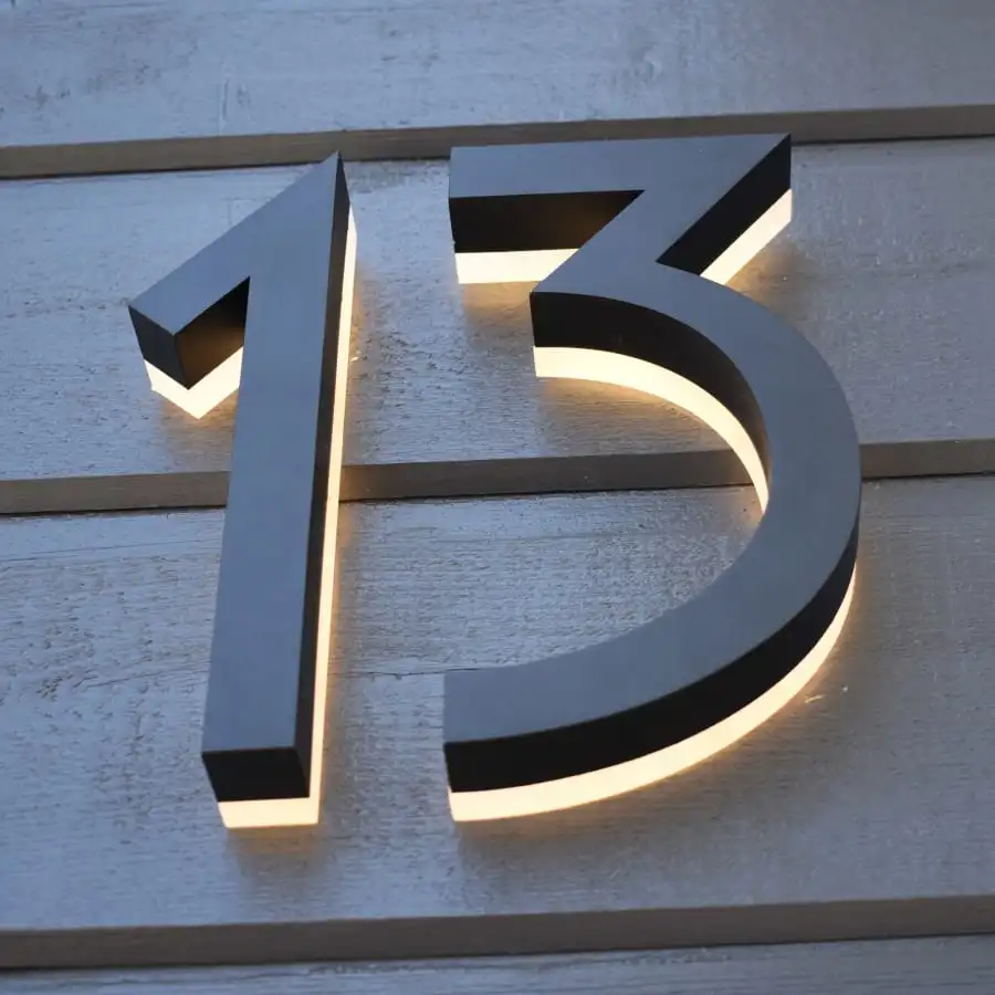 Svart husnummer/bokstav med led-bakgrundsbelysning. Högkvalitativa material och en stark bakgrundsbelysning garanterar synlighet och lång livslängd. Den svarta metallramen är gjord av rostfritt stål (kvalitet 304). led-bakgrundsbelysningen är vattentät.
