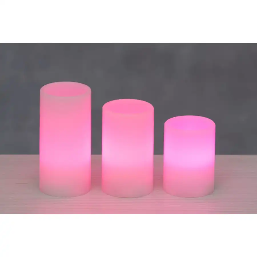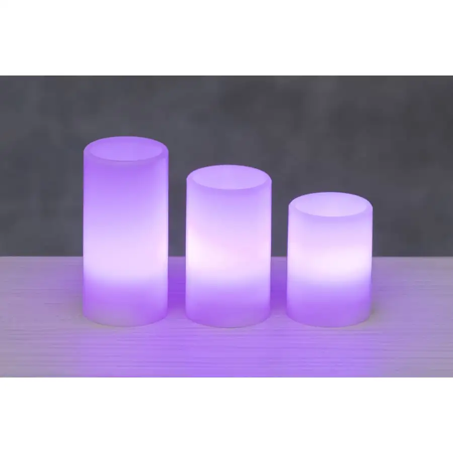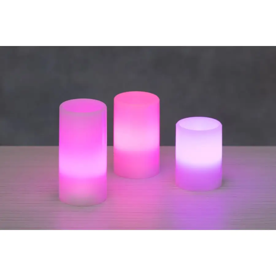The LED table candle set includes three different sizes of realistic-looking wax table candles. The candles have three different functions: colour changing, flame effect and steady colour. The atmosphere can be conveniently changed using the remote control. The candles are powered by 3 X AAA batteries (not included). Comes with remote control (CR2025 battery included). For indoor use.