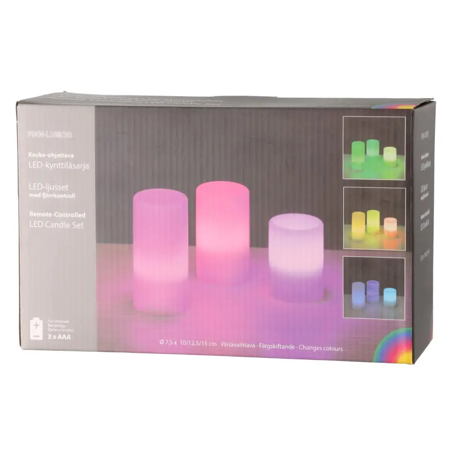 LED-pöytäkynttiläsetti sisältää kolme erikokoista aidon näköistä vahasta valmistettua pöytäkynttilää. Kynttilöissä on kolme erilaista toimintoa: väriä vaihtava, liekkiefekti ja tasainen väri. Tunnelmaa voi kätevästi vaihtaa kaukosäätimen avulla. Kynttilät toimivat 3 X AAA- paristoilla (ei sisälly pakkaukseen). Mukana tulee kauko-ohjain (CR2025 paristo sisältyy pakkaukseen). Sisäkäyttöön.
