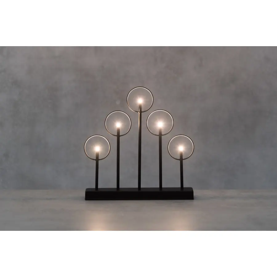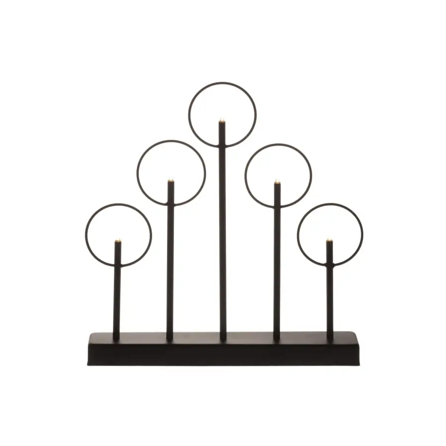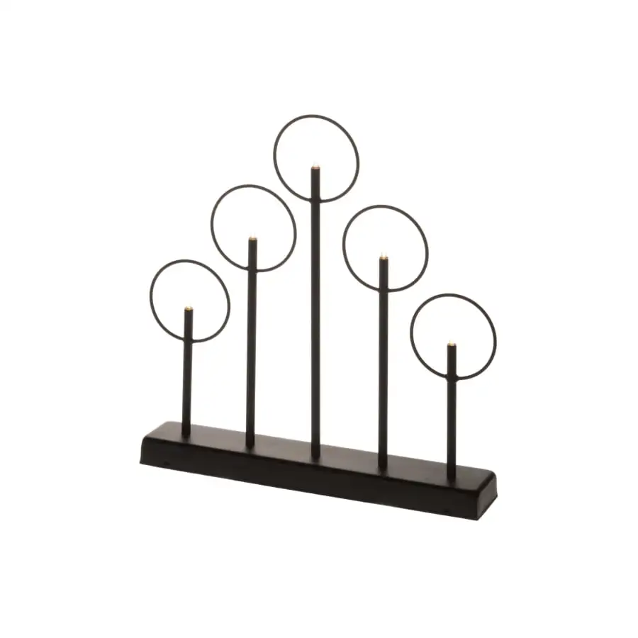 Stylish and modern black 5-bran candle for indoor use (IP20). The stand and frame of the candle is metal. The candle has 5 warm white LED lights. The battery compartment is on the foot of the candle. 6h is/18h off timer. Works with a 2 x AA battery (not included).