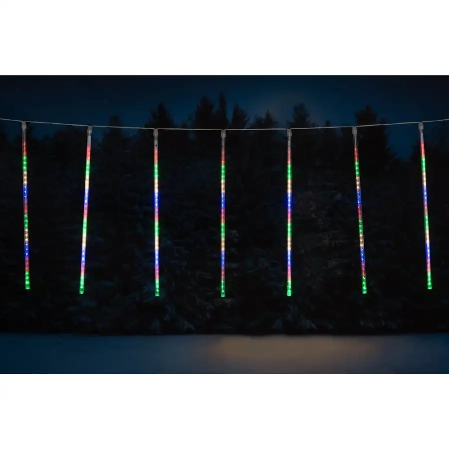 A spectacular light series of light sticks. Colourful lights moves up and down. 10 pcs Glowsticks 50 cm, each with 30 LED lights, in total 300 pcs. Sticks with red, green, yellow and blue LEDS. Transformer 4.5V, 2,25W, IP44. Light tube distance 20 cm. Cable 5 m. Indoor and outdoor use.
