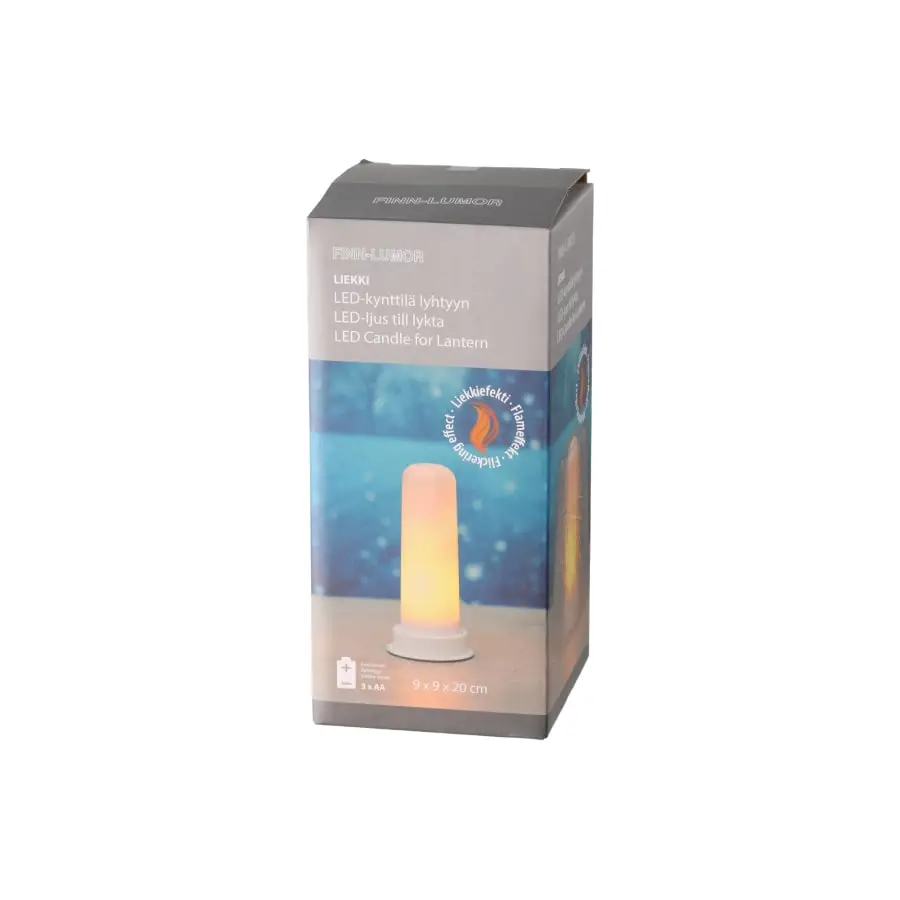 Paristokäyttöinen LED-kynttilä soveltuu mm. lyhtyihin. Valo lepattaa aidon liekin oloisesti. Koko 9 x 20 cm. Sisä- ja ulkokäyttöön.