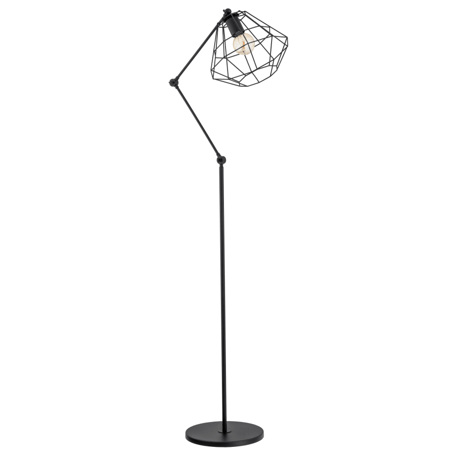 Svart golvlampa med en trendig metallskärm. Du kan justera höjden på lampan med gångjärnen i ramens tre punkter. Håller sig upprätt tack vare den breda bottenplattan. Ljuseffekt 1xE27, glödlampa ingår ej i paketet. Diameter 50cm och höjd 170cm. Lampan är tillverkad i EU.