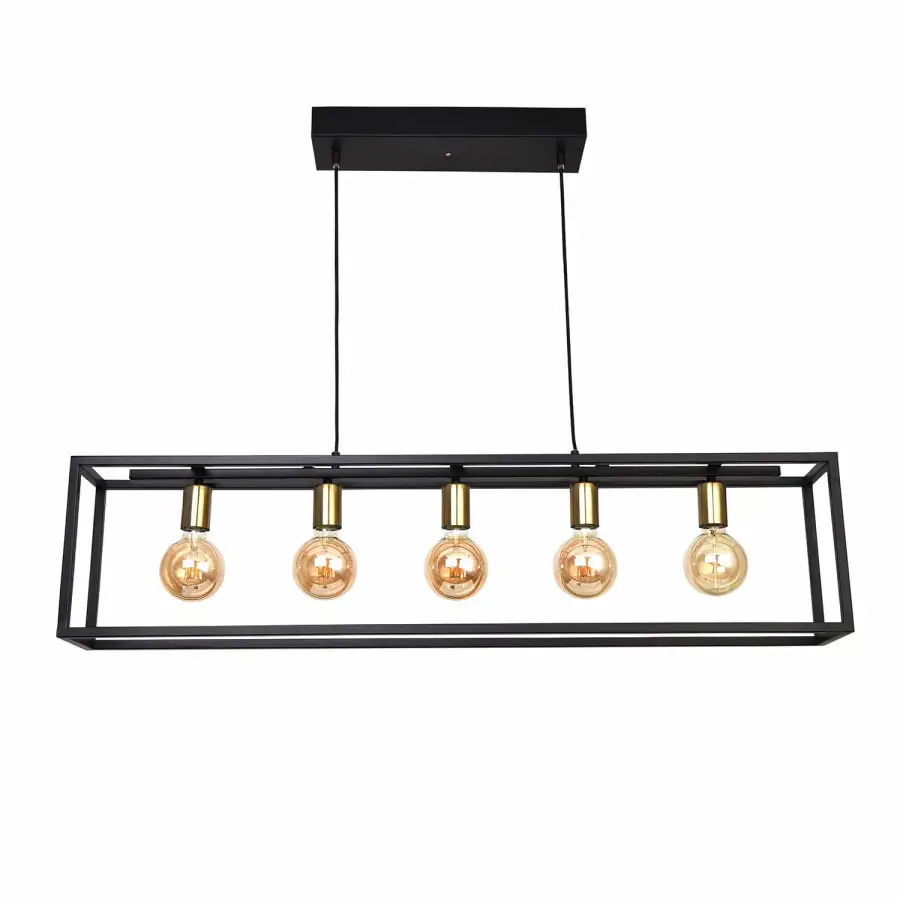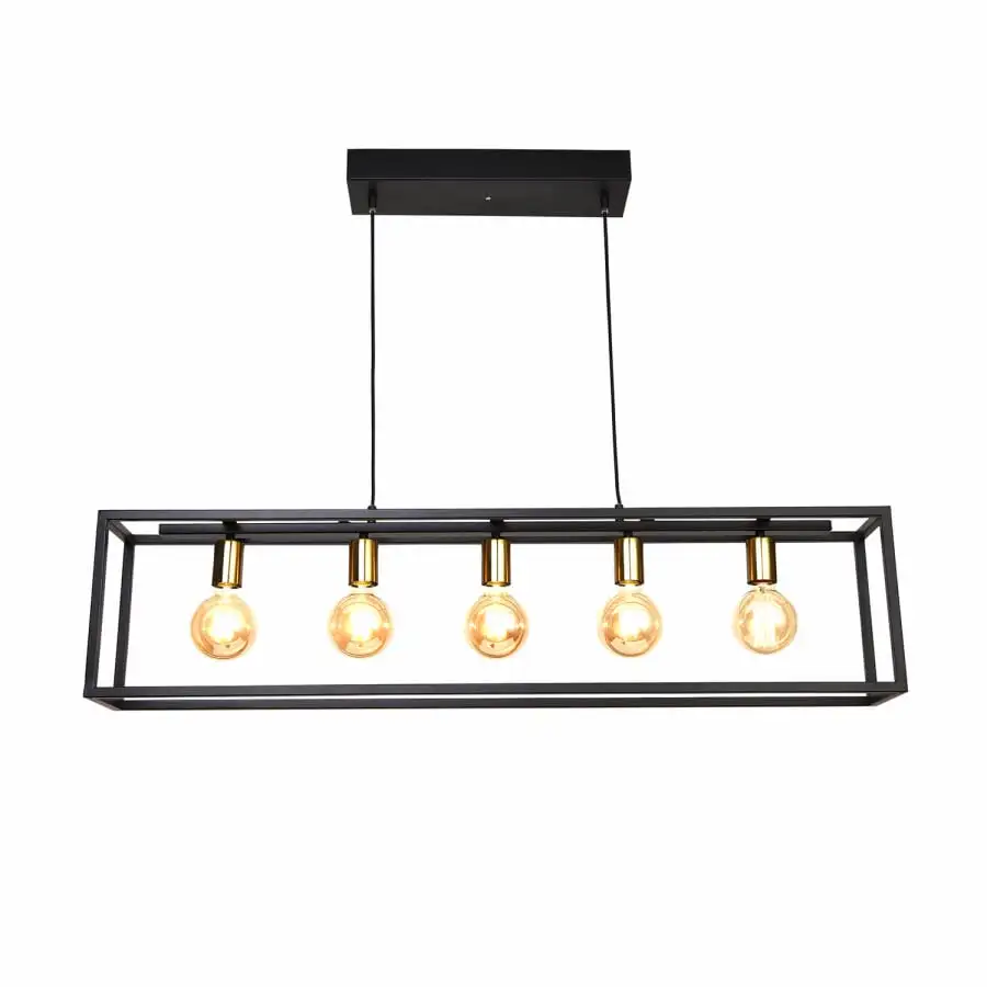 Pendellampan SVANA i storlek 110x16cm ger elegans till ditt hem. Denna lampa kombinerar en snygg metallram med fem ljuskällor (ingår ej) Denna moderna taklampa är idealisk ovanför ett matbord eller köksö eller i vardagsrummet. Höjden på lampan kan du själv bestämma (max 150cm). Precis som ljuskällor.