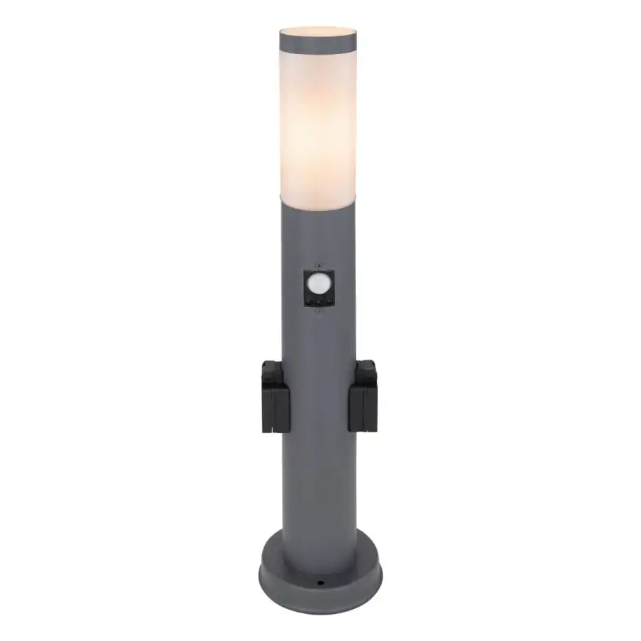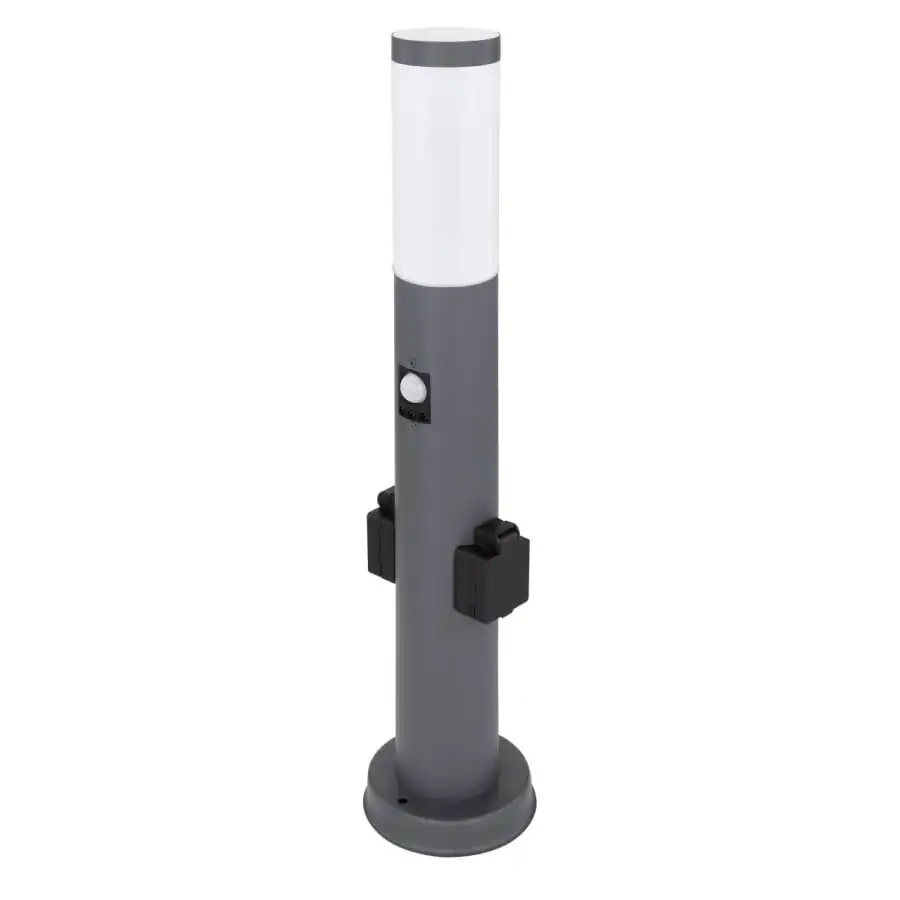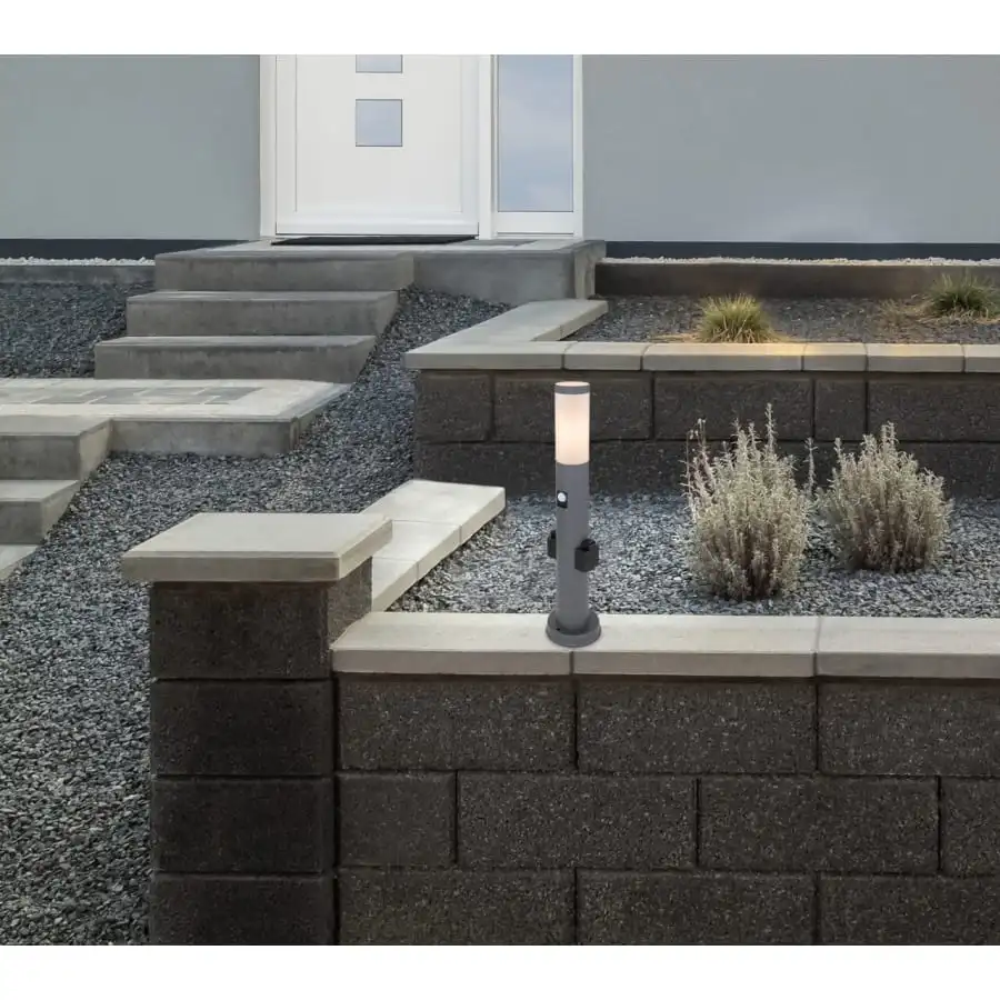 Denna snygga golvlampa i Boston I-serien har 2 uttag och en rörelsedetektor (8 meter / 90°) med 3 olika inställningar. Den moderna utomhuslampan har skyddsklass IP44, så den är perfekt för utomhusbruk. Tack vare E27-sockeln kan ljuskällan för den 60 cm rostfria lampan väljas själv (max 60W). Med de större sockellamporna i denna produktserie kan du fullborda helheten.