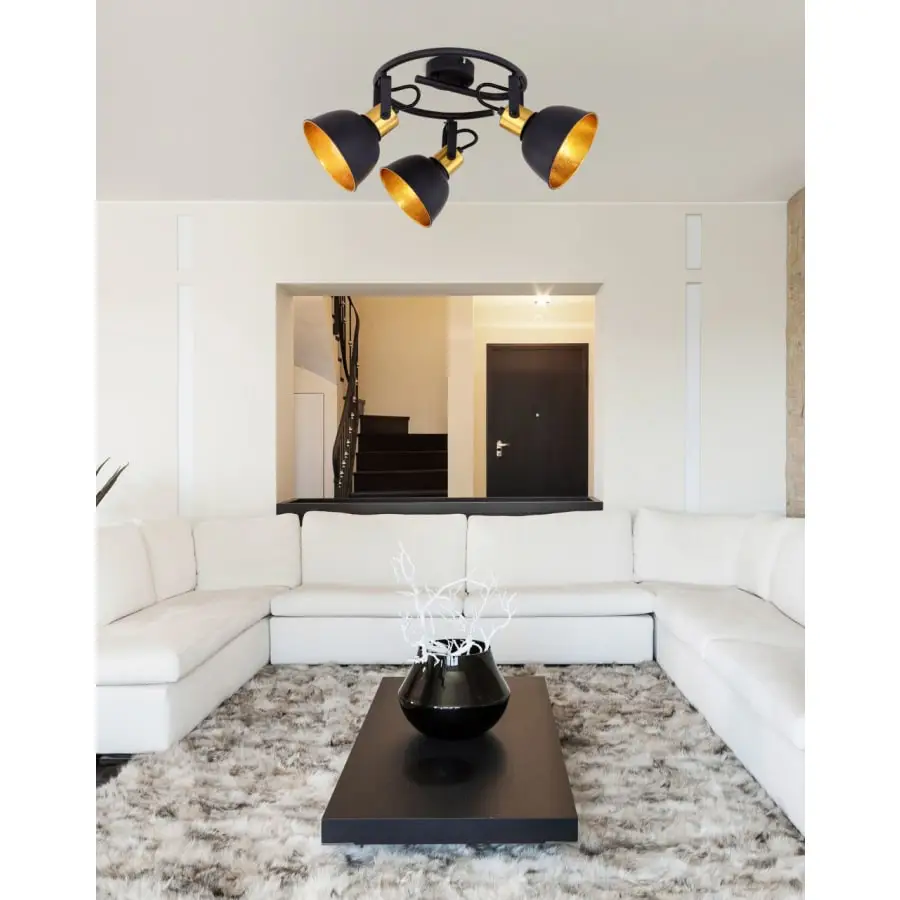 This 30 cm long spotlight from the FILLO series impresses with its refined design. Three round, movable lampshades, with a gold leaf surface on the inside, are attached to an e-shaped rod (Ø 25cm). The stylish black exterior completes the lamp. Thanks to the free choice of the light source (3xE14 / max 25W), you can determine the intensity of the light and the color temperature of the light yourself. For longevity, we recommend LED light sources. With other lamps in this series, you can complement your home decor.