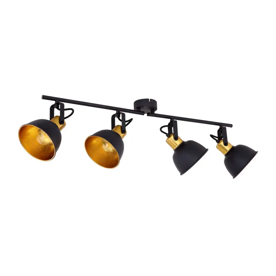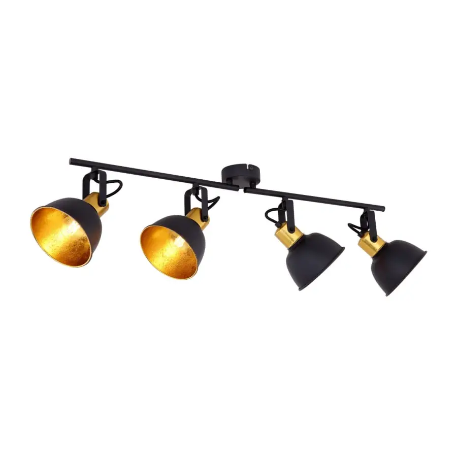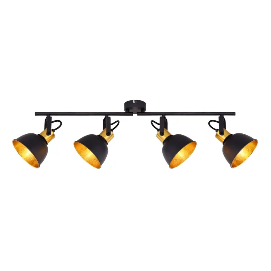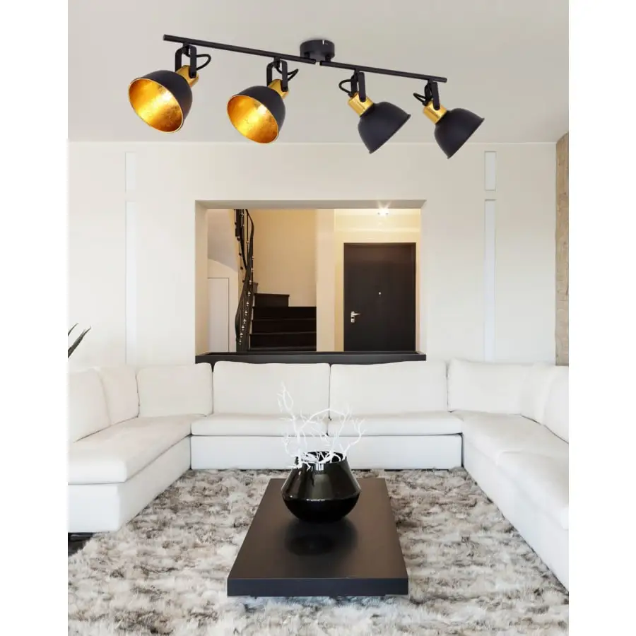 Denna 72 cm långa spotlight från FILLO-serien imponerar med sin sofistikerade design. De fyra runda, rörliga lampskärmarna, vars yta är bladguld på insidan, är fästa på två raka skenor. Den stiliga svarta exteriören kompletterar lampan. Tack vare det fria valet av ljuskälla (4xE14 / max 25 W) kan du själv bestämma ljusets intensitet och färgtemperaturen på ljuset. För lång livslängd rekommenderar vi LED-ljuskällor. Med andra lampor i denna serie kan du komplettera din heminredning.