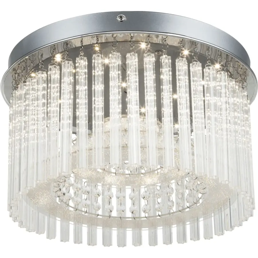 Denna iögonfallande fyrkantiga taklampa från Joyce-serien är elegant i design och av hög kvalitet. Denna kromlampa är gjord av akrylklara K5-kristaller och har klara glasstavar och klara glaskristaller som tillsammans skapar förtrollande reflektioner. Dess storlek är 37 cm. Dess 1600 lumen LED-ljuskälla avger en 4000 K ljusfärg.