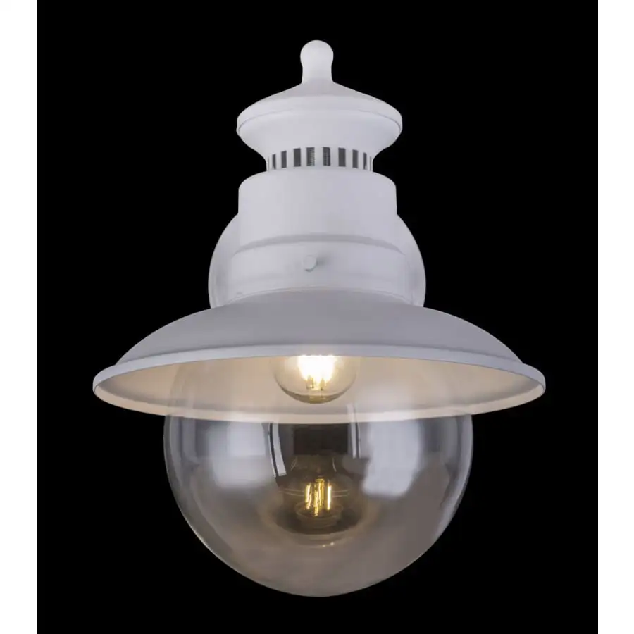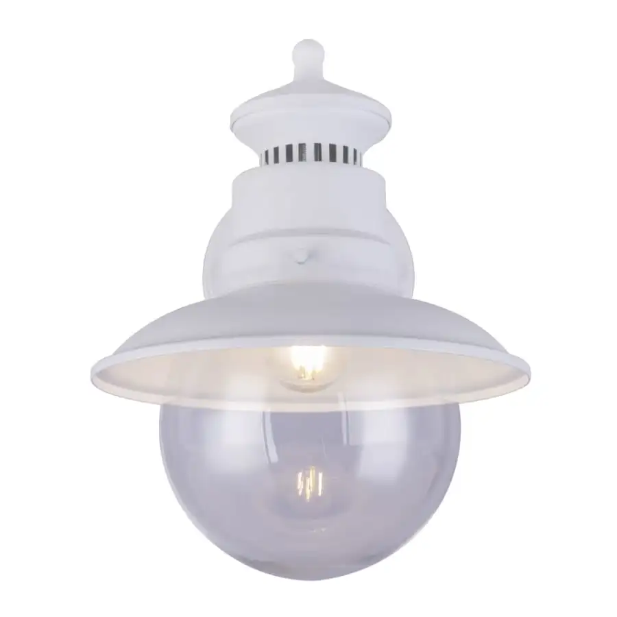 Denna snygga utomhuslampa är gjord av matt vitt stål och klart glas. Den klassiska designen på den nästan 30 cm höga vägglampan gör den mångsidig. Lampans böjda arm stödjer skärmen med sin glaskupol. Lampfoten E27 ger dig möjlighet att själv välja ljuskälla (max 60 W) och därmed även ljusintensitet och färgtemperatur. För energibesparing och livslängd rekommenderar vi LED-lampor.