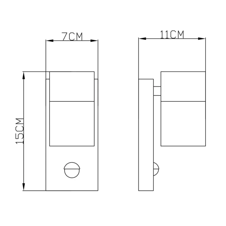Denna utomhuslampmodell tillhör Style-serien. Denna snygga vägglampa i rostfritt stål, IP44-skydd, är perfekt för utomhusbruk. Den moderna 15 cm utomhuslampan inkluderar en inbyggd rörelsedetektor (6 m / 100 °) och utbytbara LED-lampor med 420 lumen ljus och en behaglig 3000 K varmvit ljusfärgtemperatur.