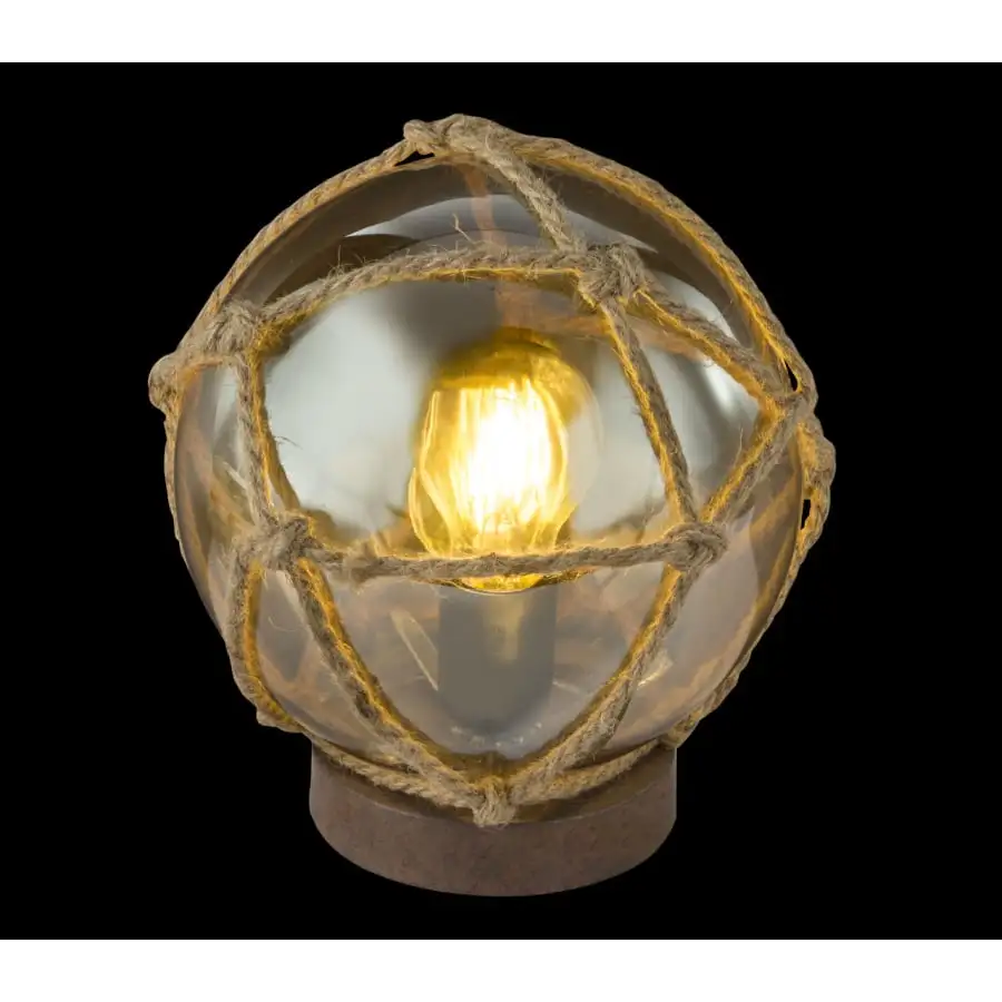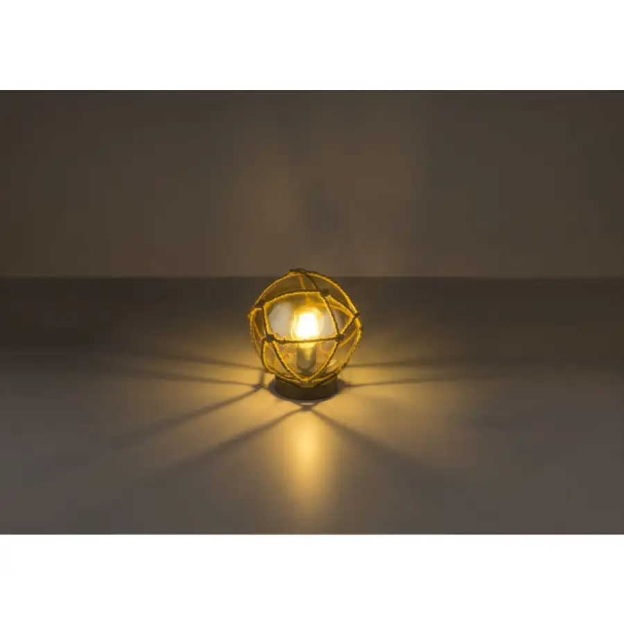 This is a rustic table lamp from the Tiko series. The light can be well integrated into the living room or hallway. Thanks to its special design, this lamp is guaranteed to be spectacular. It is made of rust colored metal, brown hemp rope and clear glass. The highlight of this model is its hemp mesh around a 20 cm glass ball. When the power is switched on, the light is thus reflected impressively. Thanks to the E27 socket, you can choose any bulb up to 40 W for this lamp. We recommend LED lamps due to their long service life and energy efficiency.