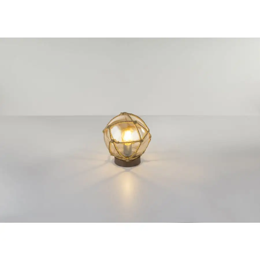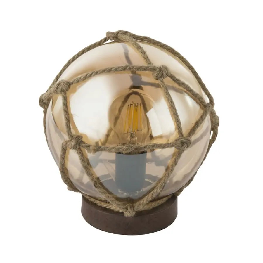 Detta är en rustik bordslampa från Tiko-serien. Ljuset kan väl integreras i vardagsrummet eller hallen. Tack vare sin speciella design är denna lampa garanterat spektakulär. Den är gjord av rostfärgad metall, brunt hamparep och klart glas. Höjdpunkten med denna modell är dess hampanät runt en 20 cm glaskula. När strömmen slås på reflekteras ljuset alltså imponerande. Tack vare E27-sockeln kan du välja vilken glödlampa som helst upp till 40 W för denna lampa. Vi rekommenderar LED-lampor på grund av deras långa livslängd och energieffektivitet.