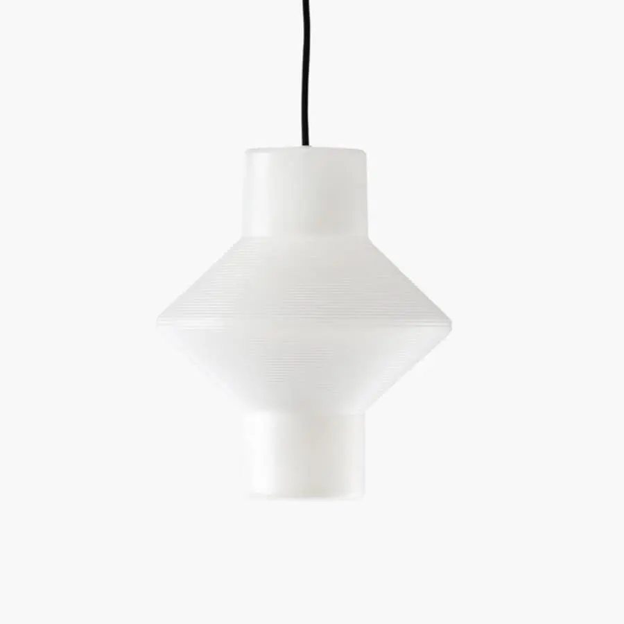 The clearly geometric, lightweight Centro pendant lamp was created by Tapio Wirkkala in 1961. The lantern-shaped polyethylene lamp was previously known as the TW001 table lamp, and now Innolux is also launching two different sized pendant lamp models in its selection, according to the original sketches. The prototypes made of the lamp were once shaped with a plastic bottle machine at the Karhula glass factory. Today, the Centro hanging lamp is created using rotational casting technology and is still manufactured in Finland. The black textile cord gives the sleek hanging lamp poise, creating a much-needed contrast to the light shade. The partial ribbing of the dome guarantees Centro’s original look.