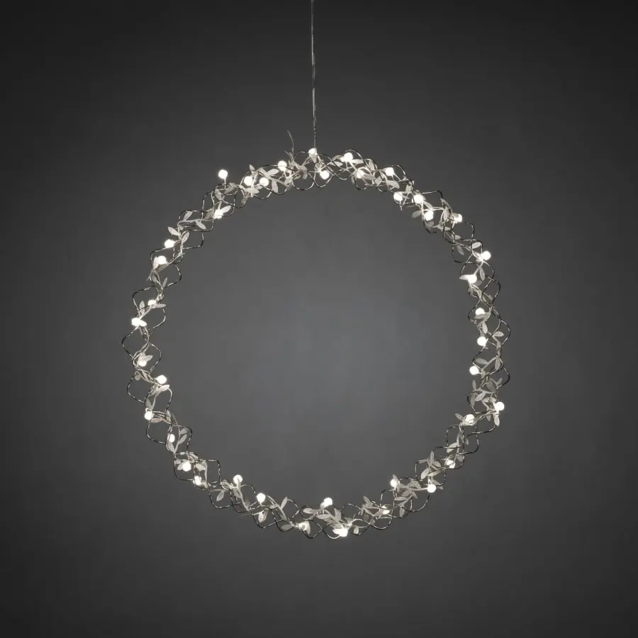 Pärlkrans silverfärgad, dia 45 cm. För inomhusbruk. I Kranss, 40 varmvita. Lysdioder och bladdekorationer. Anslutningskabellängd 5 m, transformator.