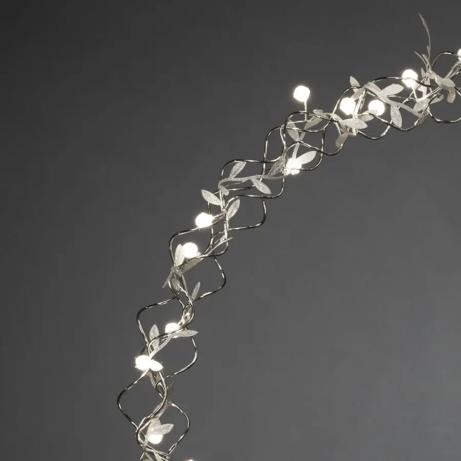 Pearl wreath silver-colored, dia. 45 cm. For indoor use. In Kranss, 40 warm white. LEDs and leaf decorations. Connection cable length 5 m, transformer.