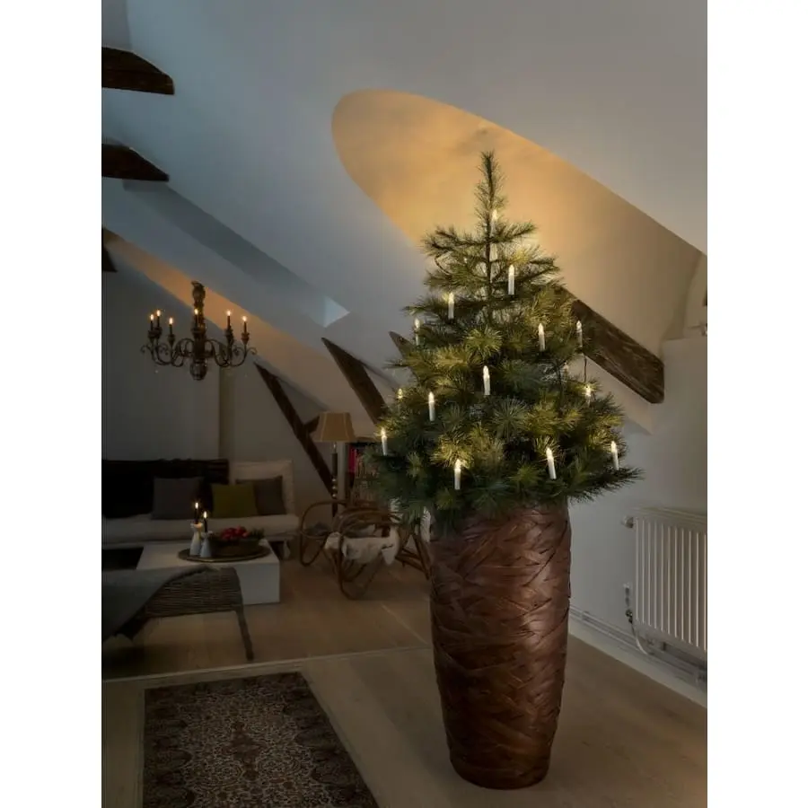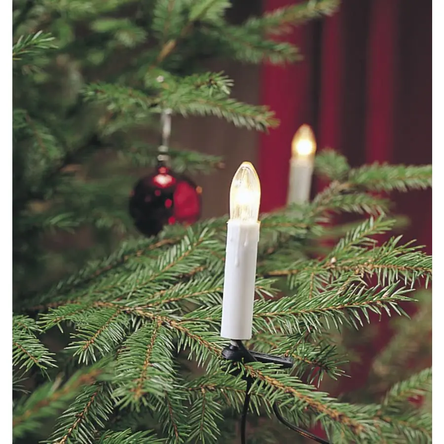 Spruce candle set intended for indoor use, with 15 push-in led candles. Green cable with a total length of 710 cm, of which the connecting cable is 150 cm. The distance between the candles is 40 cm. 230 V.