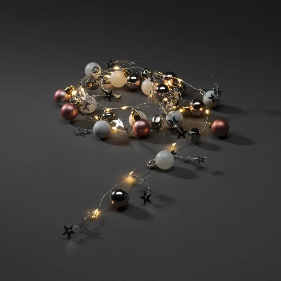 Paristovalosarja sisäkäyttöön, roosan, valkoisen ja hopean värisiä palloja, hopeanvärisiä tähtikoristeita.