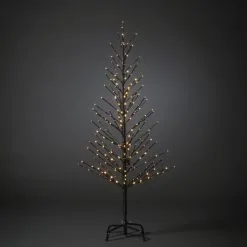 Ett svart ljusträd lämpligt för utomhusbruk, med 120 blinkande och 120 stadigt brinnande bärnstensfärgade lysdioder. Höjd 150 cm och bredd 45 cm. Längden på anslutningskabeln är 500 cm. Stödben ingår. Transformator.