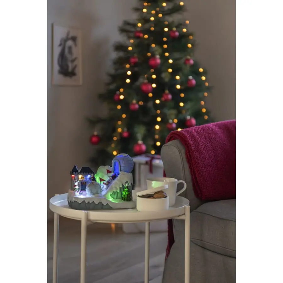 A Christmas decorated ski slope with music playing. 8 colorful LEDs. Height 16.5 cm and width 21.5 cm, depth 13 cm. The length of the connection cable is 180 cm. Transformer 4.5 V. For indoor use, IP20.