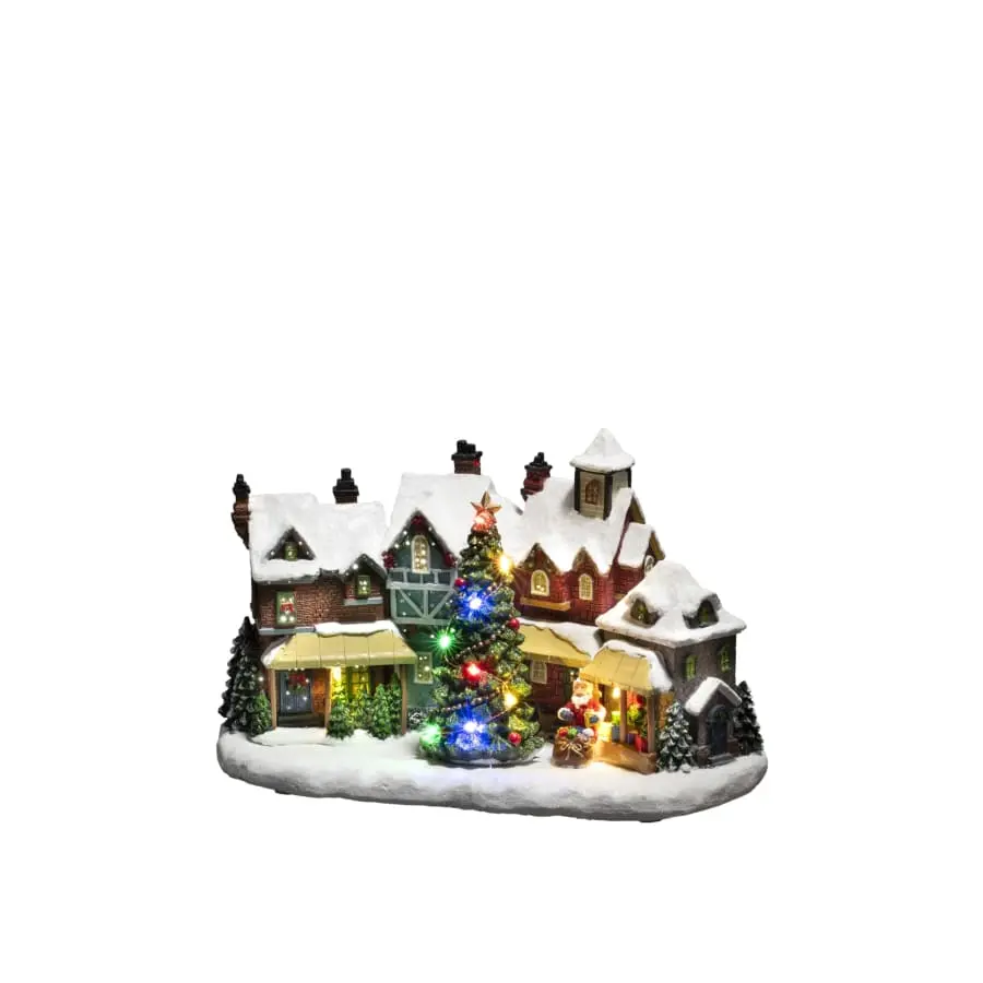 Fiber optic decoration ”houses” with 13 colored LEDs and music. Can be used with a transformer or battery operated (batteries 3xAA not included). The length of the connection cable is 180 cm. Product dimensions: height 18 cm, width 30 cm, depth 17 cm. For indoor use.