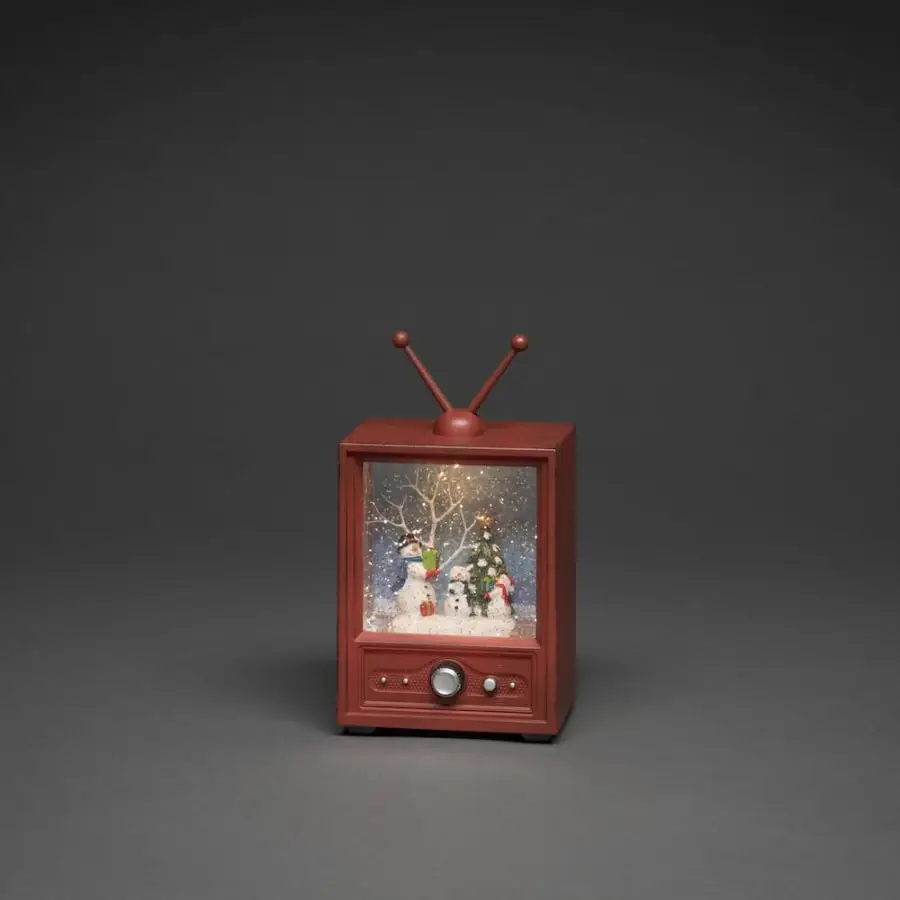 Table decoration water-filled lantern TV with snowmen and fir tree. Warm white led. Height 21.5 cm and width 12.5 cm. Works with either mains power (transformer) or batteries, 3xAA. Batteries are not included with the product. The length of the connection cable is 180 cm. For indoor use.