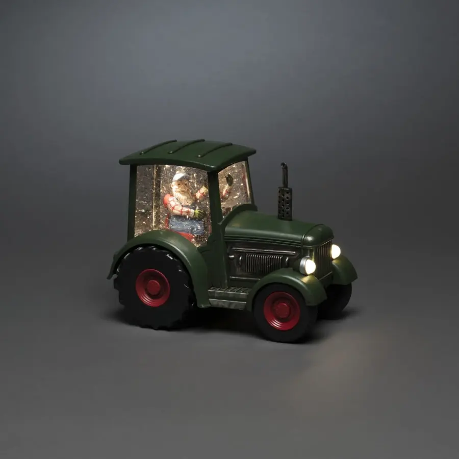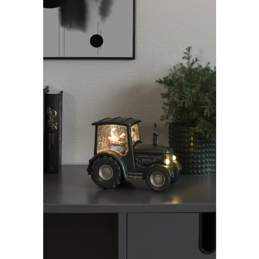 Vattenfylld ljusdekoration ”traktor och jordsvin”. Lyktan är upplyst av tre varmvita lysdioder. Höjd 17 cm, bredd 24 cm och djup 13,5 cm. Timer 5 h. Batteridriven, batterier 3xAA ingår ej. För inomhusbruk, IP20.