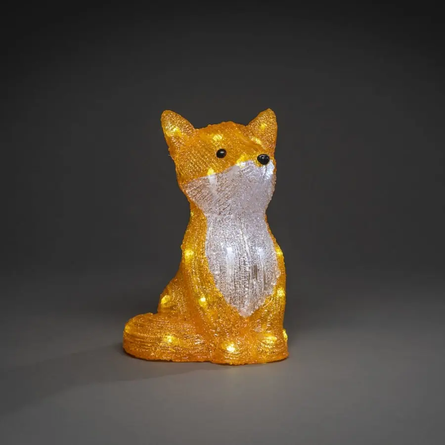 Akrylräv med 32 vita lysdioder. Höjd 27 cm och bredd 19 cm. Längden på anslutningskabeln är 500 cm. Transformator. För utomhusbruk.