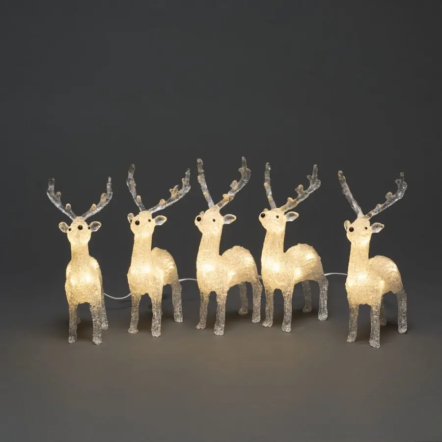 Light set acrylic reindeer, 5 pcs/set. A total of 5×8 warm white LEDs. Reindeer height 19 cm, width 13 cm and depth 7 cm. The total length of the light set is 900 cm, of which the connecting cable is 500 cm. The color of the wire is white. The reindeer are 100 cm apart. Transformer 24 V. For outdoor use, IP44.