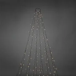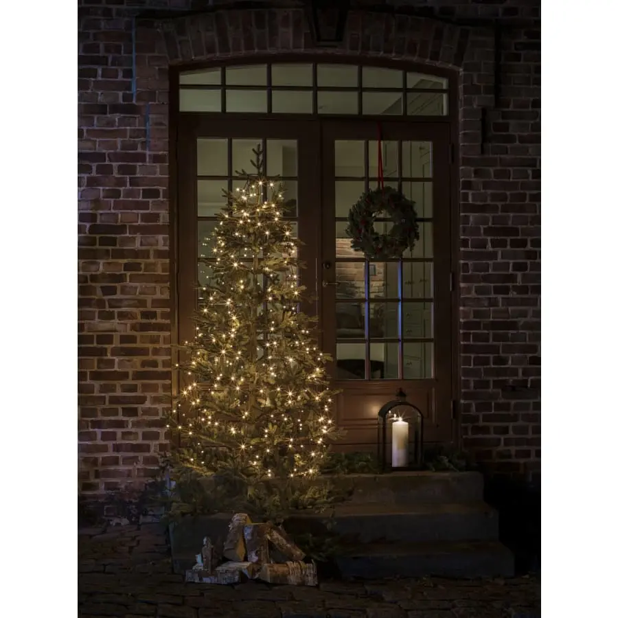 Christmas tree light series with 270 warm white LEDs with frosted ends. Six light strips come from the top circle, which in the lower part are divided into 12 light strips. The total length is 240 cm. Wire color black. The transformer has a timer for 8 h. For outdoor use, IP44.