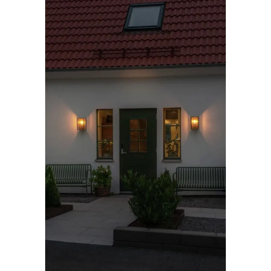 Konstsmide Carpi 7347-800 utomhusvägglampa, IP44, längd 13,50 cm, bredd 18 cm, höjd 30 cm, klarglas, stålkropp, kroppsfärg mässing, glödlampa E27 max 1x60W ingår ej, glödlampa max höjd 140 mm, kan kedjas, tryck in anslutningsdosa, kan utanpåliggande monteras, reservglas kan beställas med kod 7347-001