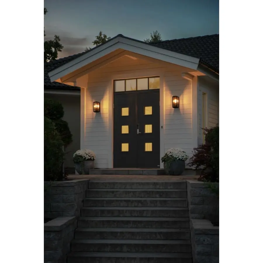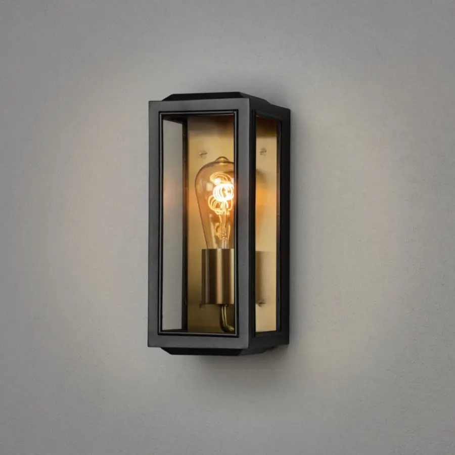 Konstsmide Carpi 7348-758 utomhusvägglampa, IP44, längd 15 cm, bredd 12,5 cm, höjd 30 cm, klarglas, stålkropp, karossfärg svart/mässing, glödlampa E27 max 1x60W ingår ej, glödlampa max höjd 140 mm, kan vara kedjad, tryck in kopplingsdosa, kan utanpåliggande monteras, reservglas kan beställas med kod 7348-001