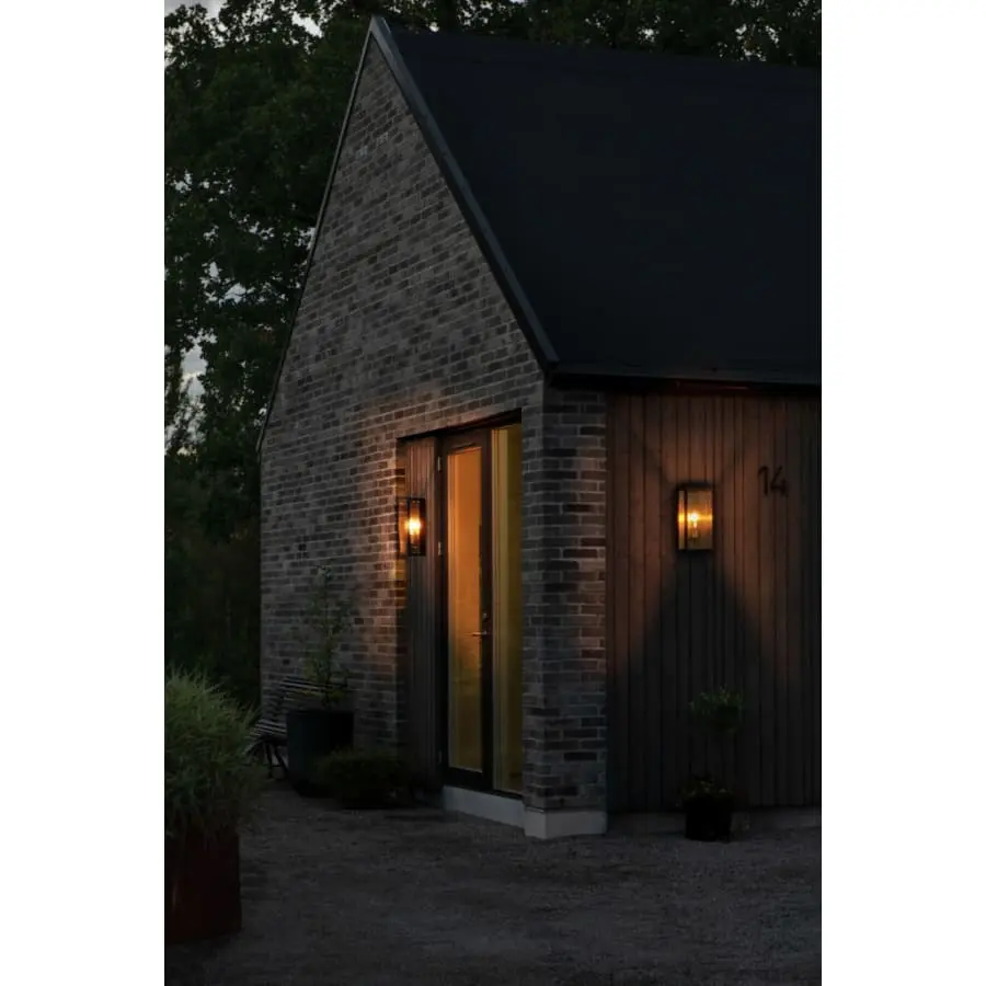 Konstsmide Carpi 7349-758 utomhusvägglampa, IP44, längd 12,5 cm, bredd 20,5 cm, höjd 40 cm, klarglas, stålkropp, kroppsfärg svart/mässing, glödlampa E27 max 1x60W ingår ej, glödlampa max höjd 140 mm, kan vara kedjad, insticksbox, kan utanpåliggande monteras, reservglas kan beställas med kod 7349-001