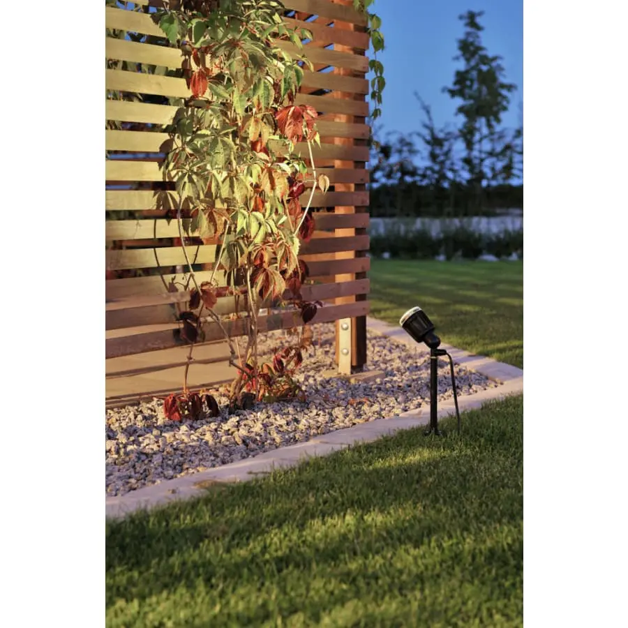 Konstsmide Amalfi 7440-000 12V trädgårdsstrålkastare, IP44, längd 11,5 cm, bredd 6 cm, höjd 41 cm, klar akryl, stomme aluminium, karossfärg svart, fast LED 1W, 70lm, 3500K, anslutningskabel 10 m, 12V/12W transformator , jordspets och väggfäste ingår i paketet, reservtransformator kan beställas separat med kod 7483-000, lampan kan användas ensam eller den kan anslutas som en del av Konstsmides 12V-system, till vilken det går att ansluta flera olika typer av lampor och tillbehör