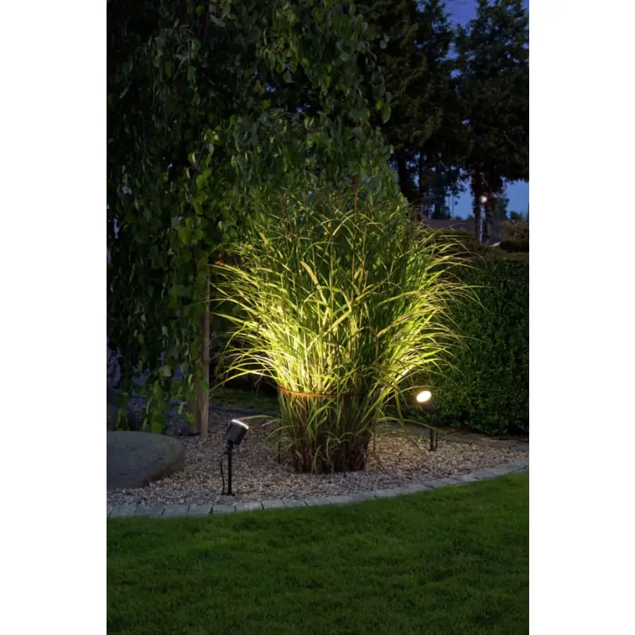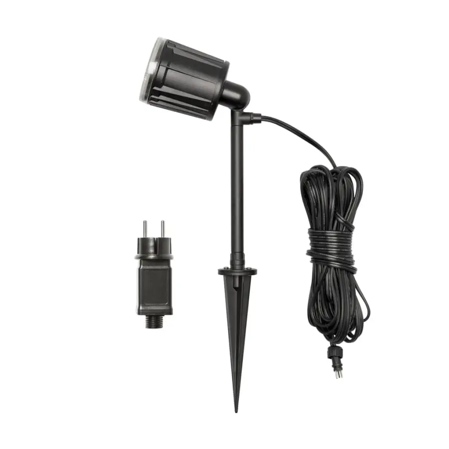 Konstsmide 12V serie Amalfi 7447-000 trädgårdsstrålkastare, IP44, längd 15 cm, bredd 8 cm, höjd 41 cm, klar akryl, kropp aluminium, kroppsfärg svart, fast LED 4W, 280lm, 3500K, anslutningskabel 10 m, 12V/12W transformator, jordspets och väggfäste ingår i paketet, reservtransformator kan beställas separat med kod 7483-000, lampan kan användas ensam eller kopplas in som en del av Konstsmides 12V-system, till vilken det går att ansluta flera olika typer av lampor och tillbehör