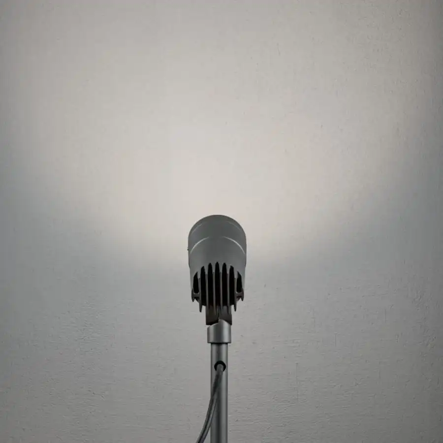 Konstsmide 12V serie Andria 7475-370 trädgårdsspotlight, IP44, längd 13,5 cm, bredd 7 cm, höjd 27 cm, klar akryl, ram aluminium, ramfärg mörkgrå, fast LED 3W, 210lm, 3000K, anslutningskabel 2+8 m, 12V /12W transformator, justerbar vertikal orientering 150 grader, reservtransformator kan beställas separat med kod 7483-000, lampan kan användas ensam eller den kan anslutas som en del av Konstsmidens 12V system, till vilken det går att ansluta flera olika typer av lampor och tillbehör