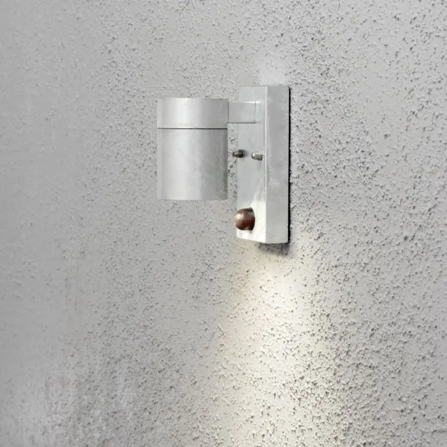 Konstsmide Modena 7541-320 utomhusvägglampa, IP44, längd 11 cm, bredd 6,5 cm, höjd 14 cm, klarglas, stålkropp, karossfärg galvaniserat stål, glödlampa GU10 max 1x35W ingår ej, glödlampa max höjd 64 mm, downlight, motion detektor