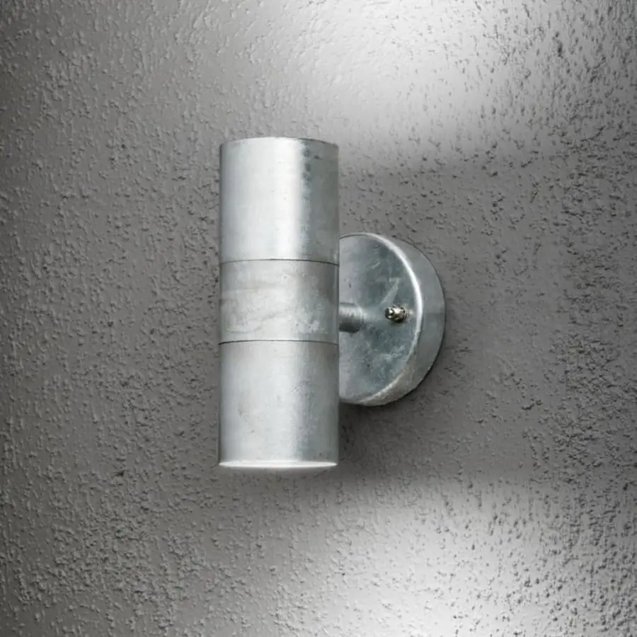 Konstsmide Modena 7571-320 utomhusvägglampa, IP44, längd 9 cm, bredd 6 cm, höjd 17 cm, klarglas, stålkropp, karossfärg galvaniserat stål, glödlampa GU10 max 2x35W ingår ej, glödlampa max höjd 64 mm, upp och ner lätt, utanpåliggande kablage monteringssockel 449-250/750 kan beställas separat