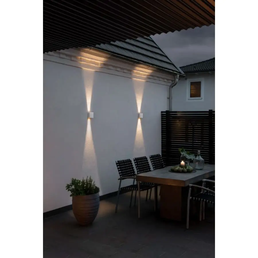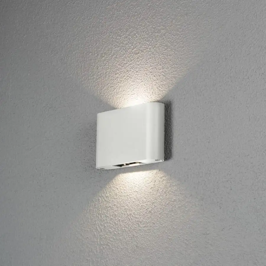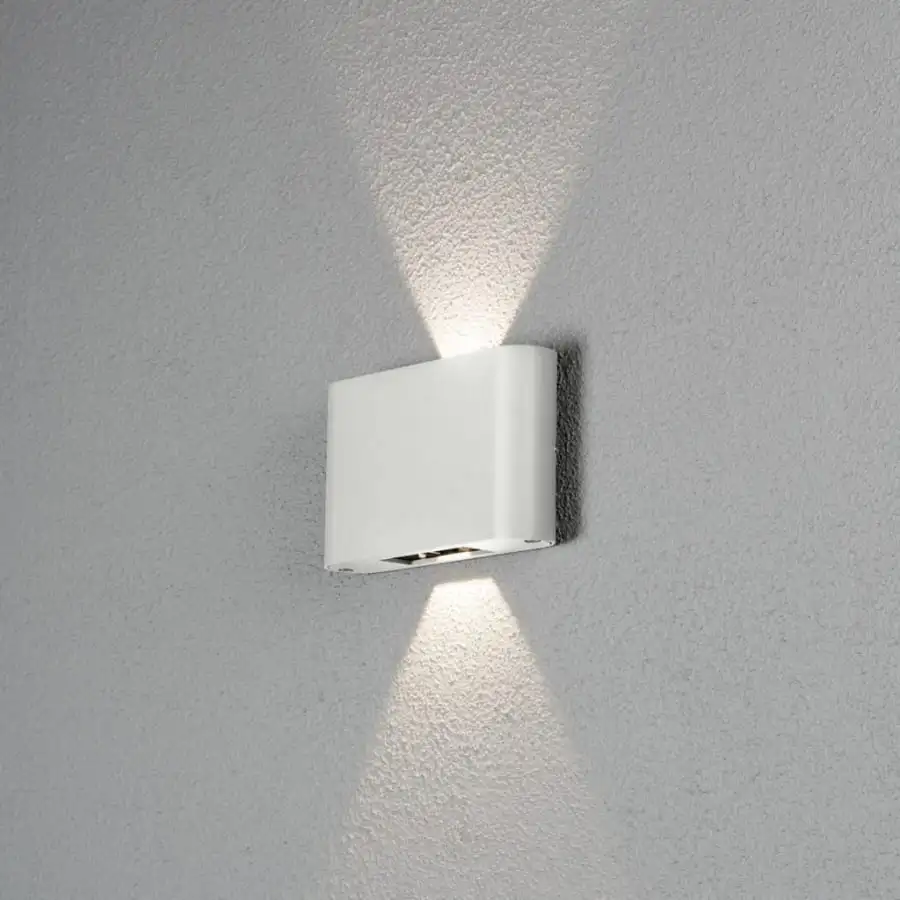 Konstsmide Chieri 7854-250 utomhusvägglampa, IP54, längd 4,5 cm, bredd 18 cm, höjd 11,5 cm, klarglas, kropp aluminium, kroppsfärg vit, 900lm, fast LED 2x6W, 3000K, ljus upp och ner, öppningsvinkeln på ljuset kan justeras mellan 0 och 90 grader